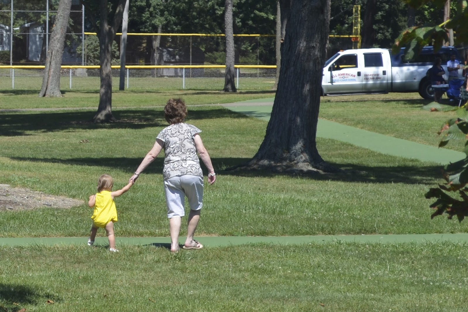 Saturday: Family reunion at Price Park. Nanny took the Girly to get a snow cone. She walked the whole way over and back to the pavilion. Her favorite part of the reunion was the cookie tray and playing on the swings.